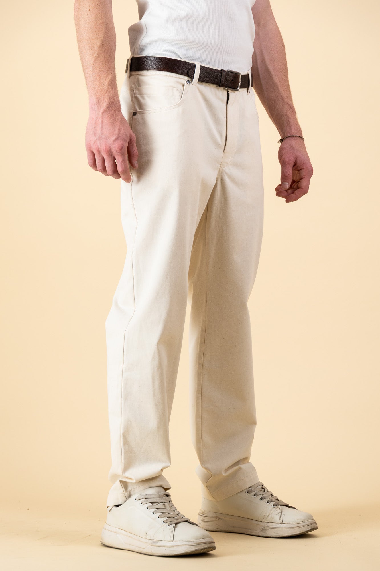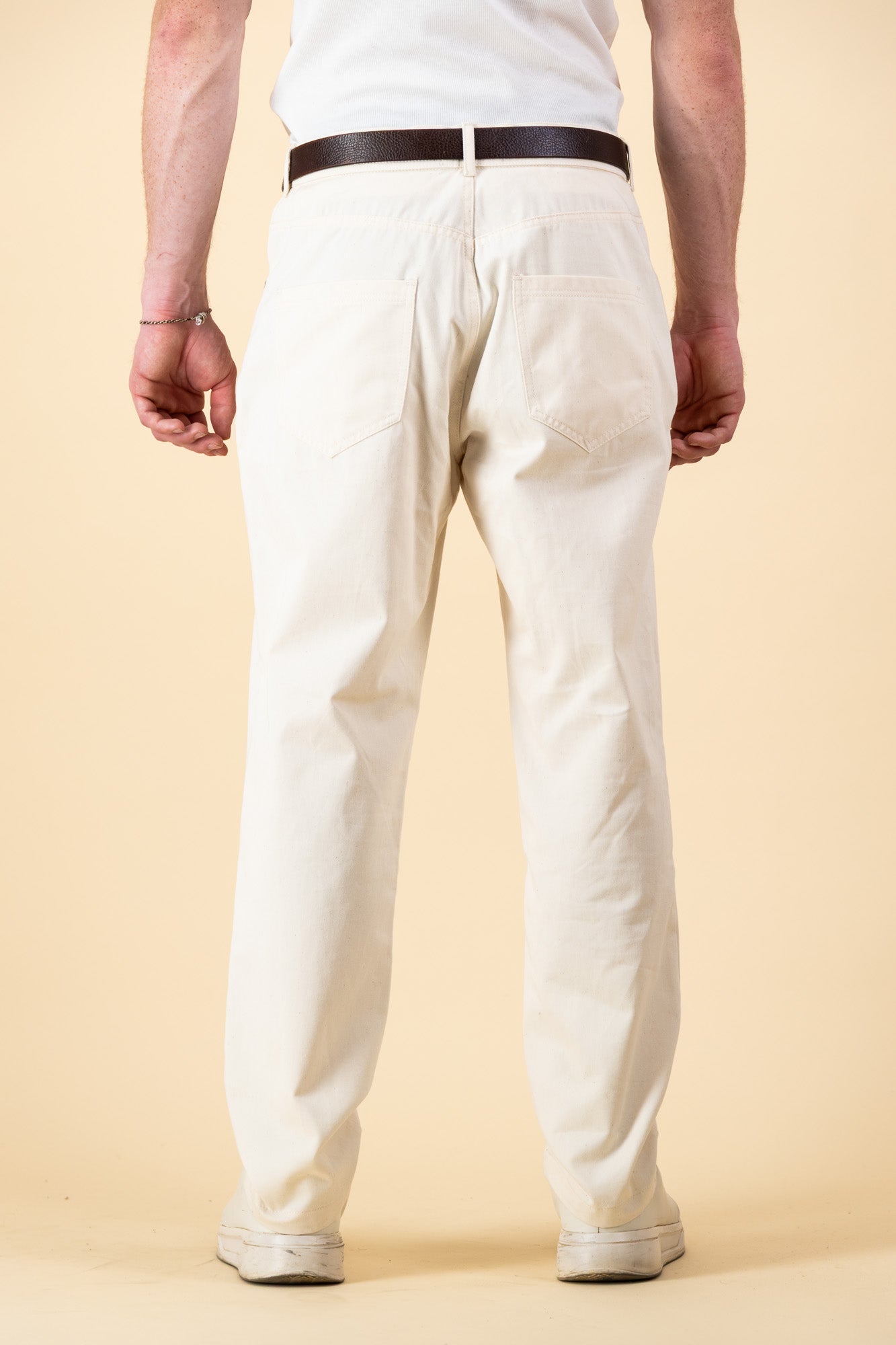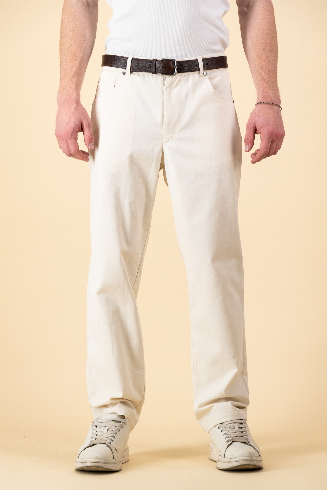 Crafted from unbleached cotton with natural seed flecks, these regular-fit jeans offer a raw, earthy aesthetic with durable everyday wear. Finished with metal rivets and buttons, a button-and-zip closure, two back pockets, and a handy phone pocket for modern utility.