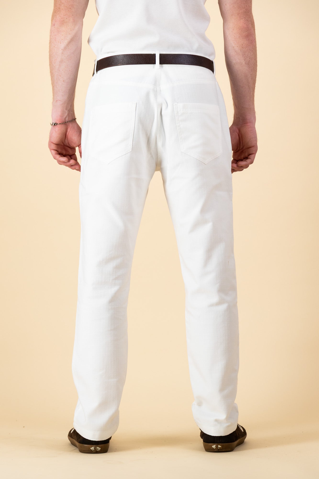Classic and crisp, these white cotton denim jeans feature a regular fit for comfortable everyday wear. Finished with durable metal rivets and buttons, a button-and-zip front closure, two back pockets, and a convenient phone pocket.
