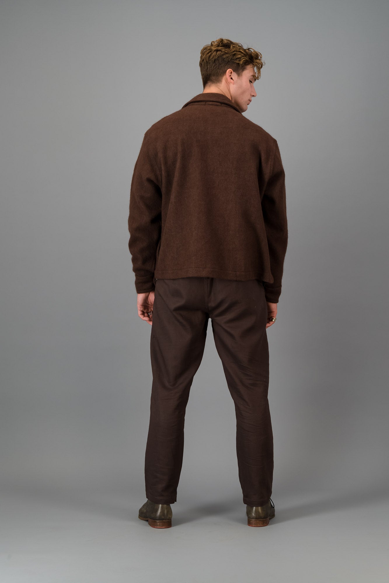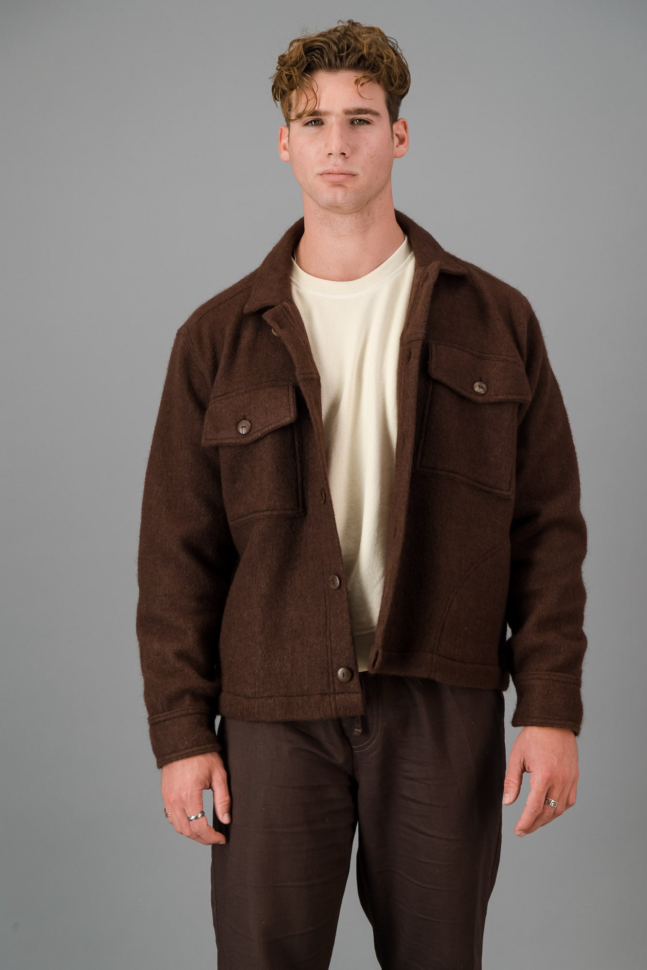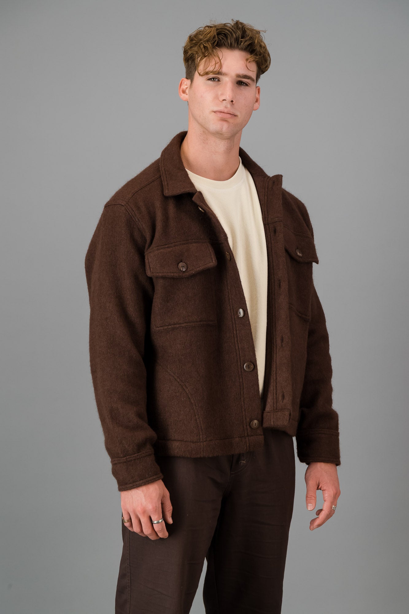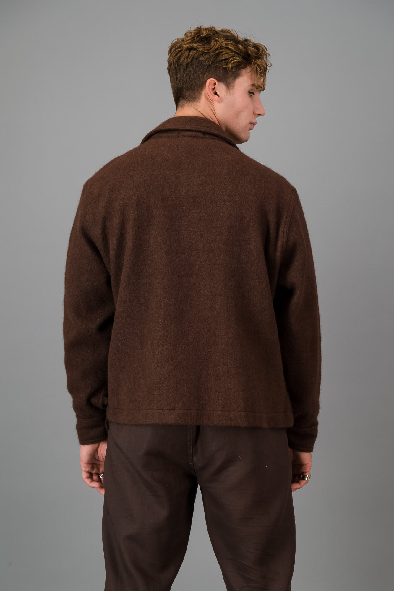 Crafted from melton fabric with a knitted texture, this jacket offers a soft, plush feel that ensures all-day comfort. The rich chocolate hue adds a touch of elegance and versatility, making it a stylish choice for various occasions. Its unique fabric and color combination provide a contemporary twist on the traditional denim jacket, offering a refined and polished look.