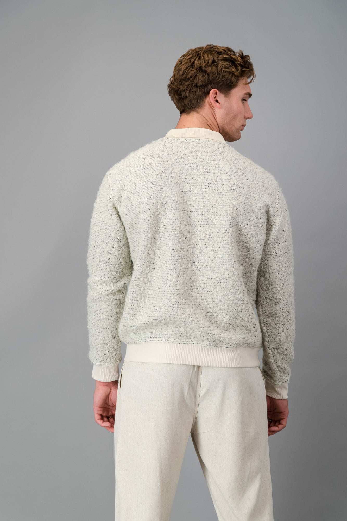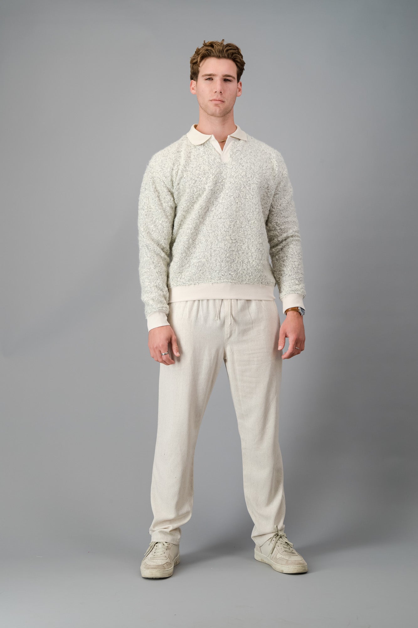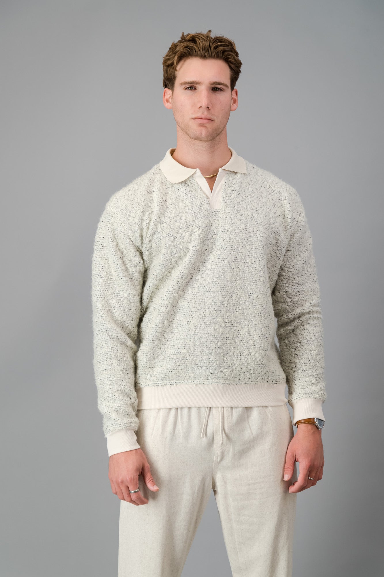 Elevate your wardrobe with our Off-White Boucle Long-Sleeve Polo with its textured, wool-like appearance.