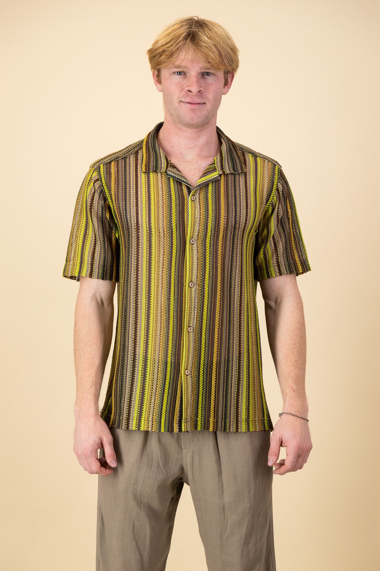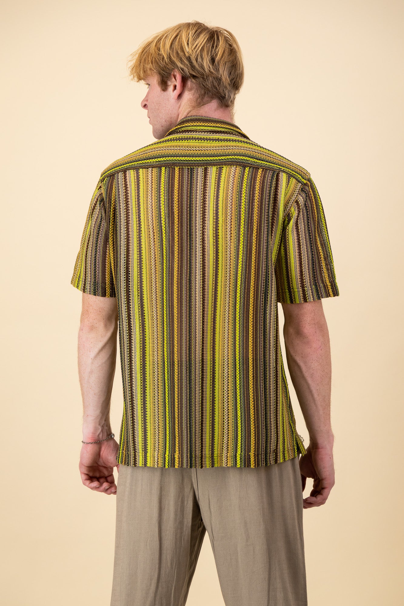 Celebrate fall vibes with this polyester lace and crochet short-sleeved shirt. Featuring warm autumn-coloured stripes, a relaxed boxy fit, and a revere collar, it’s perfect for effortless resort style. The button-front closure adds classic detail for versatile seasonal wear.