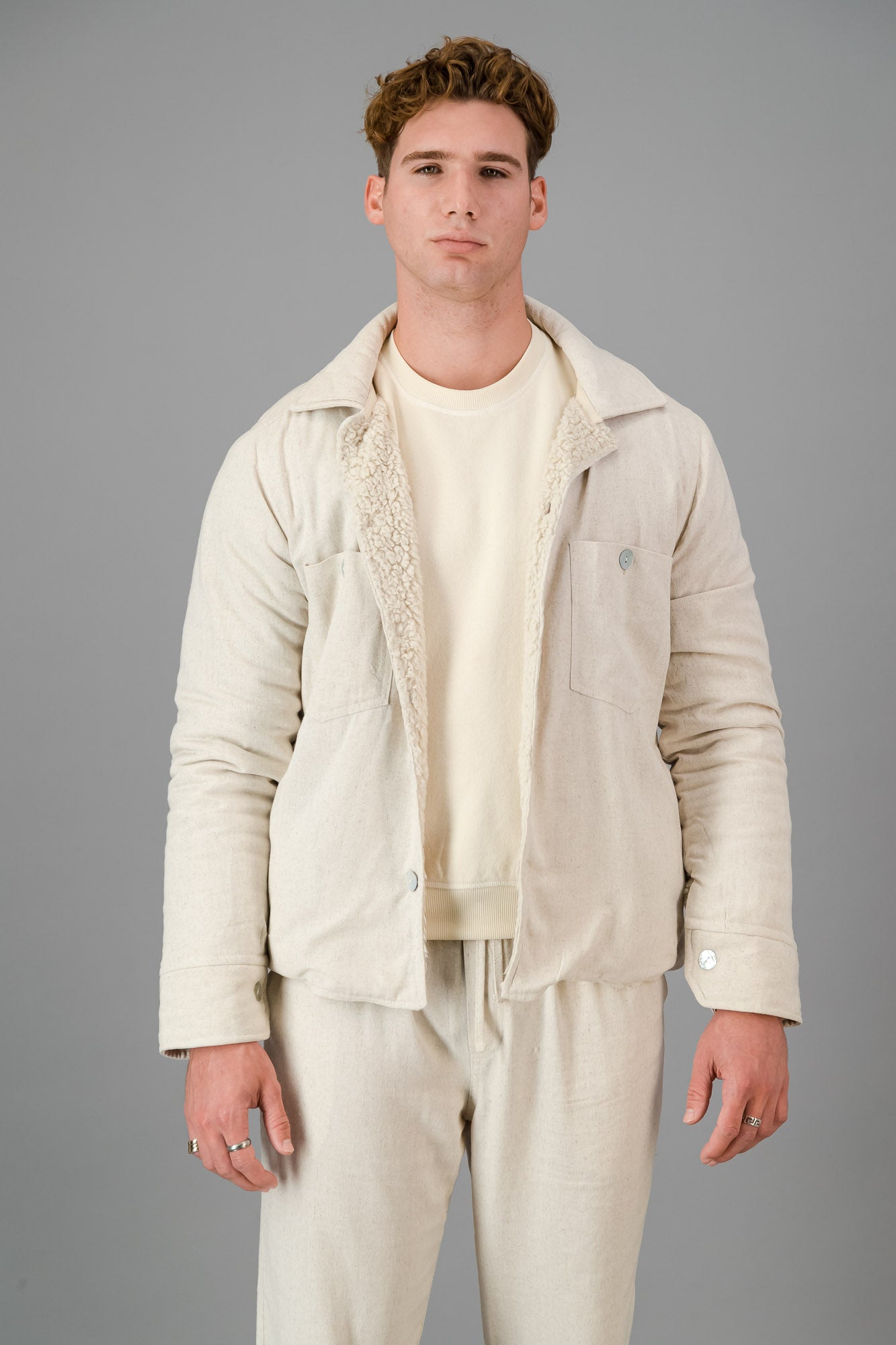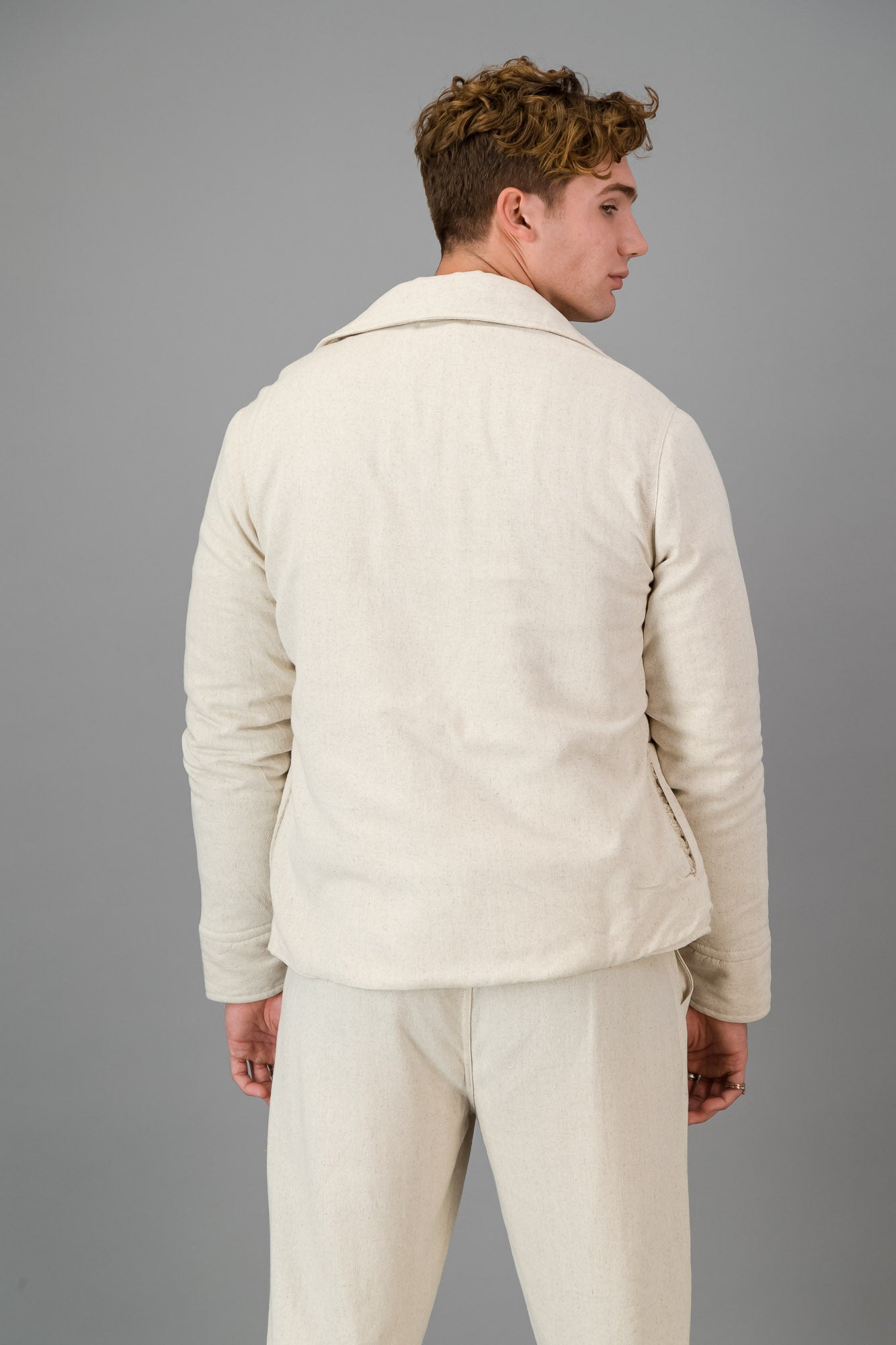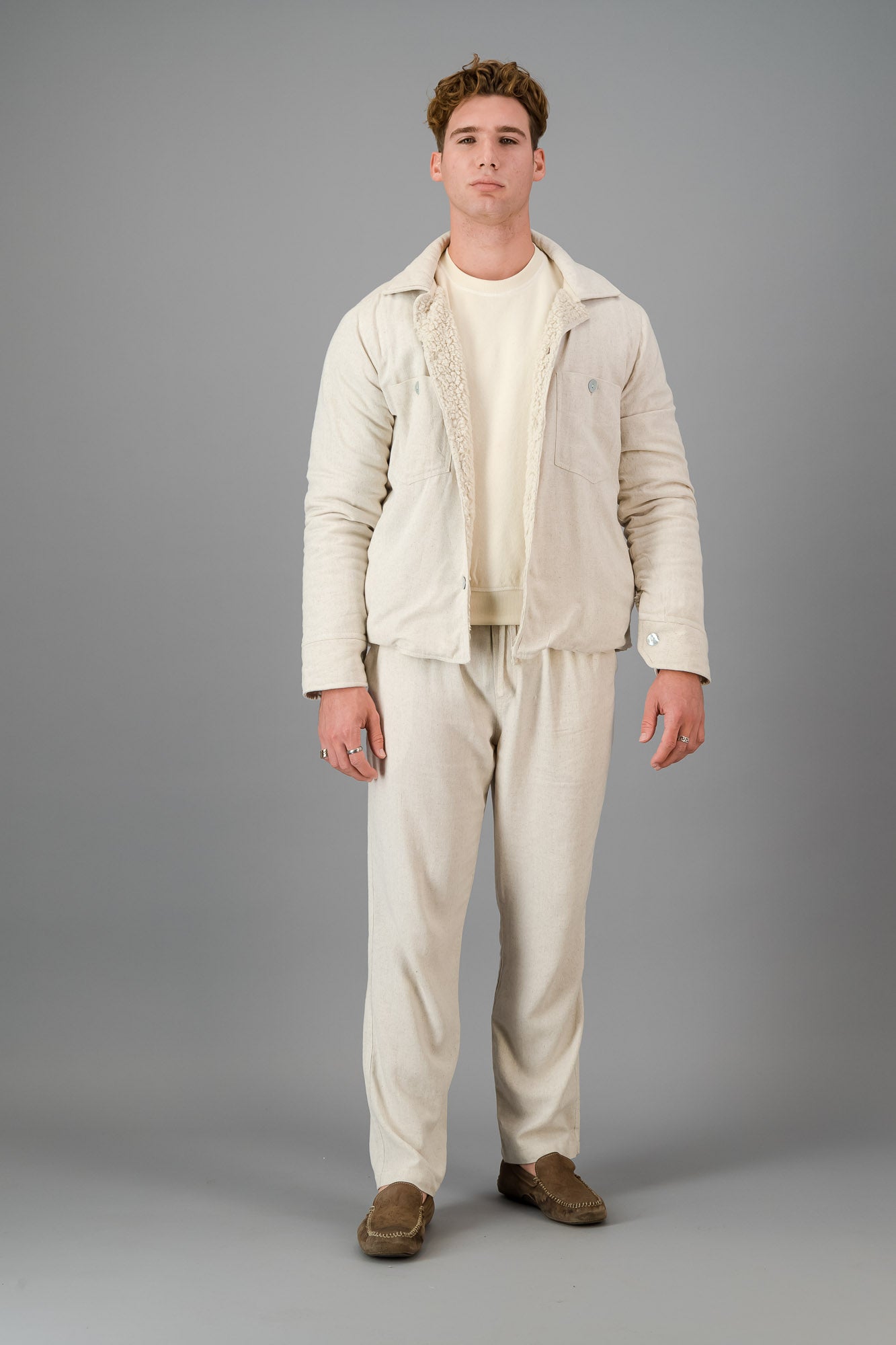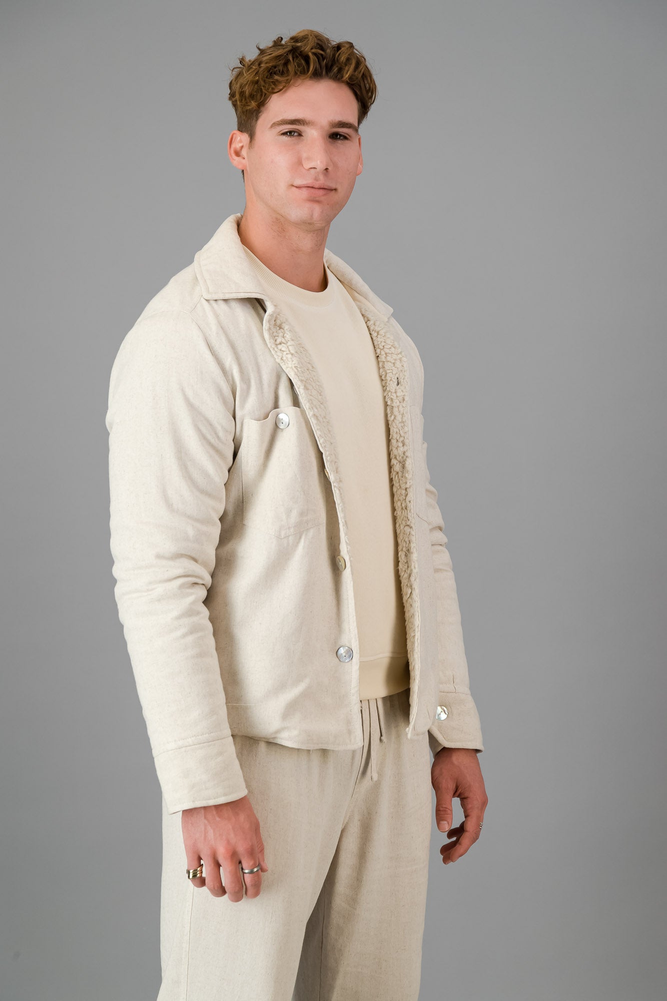 Introducing our Oatmeal Linen Viscose Shacket - a versatile blend of a shirt and jacket that combines style, comfort, and functionality. Perfect for transitional weather, this shacket is an essential addition to your wardrobe, offering a refined yet relaxed look.